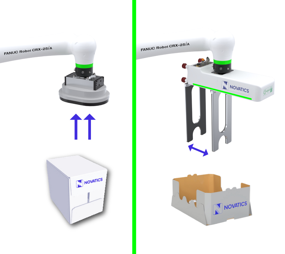 La pince collaborative Novatics est motorisée et équipée d’un contrôle de force. Sa pression est progressive et s’applique uniquement au contact du carton.