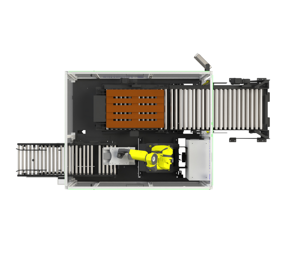 Le palettiseur automatique compact est doté d’un convoyeur d’entrée/sortie superposé pour les palettes. Cette conception maintient le flux de production, même lorsqu’il faut changer ou évacuer une palette.